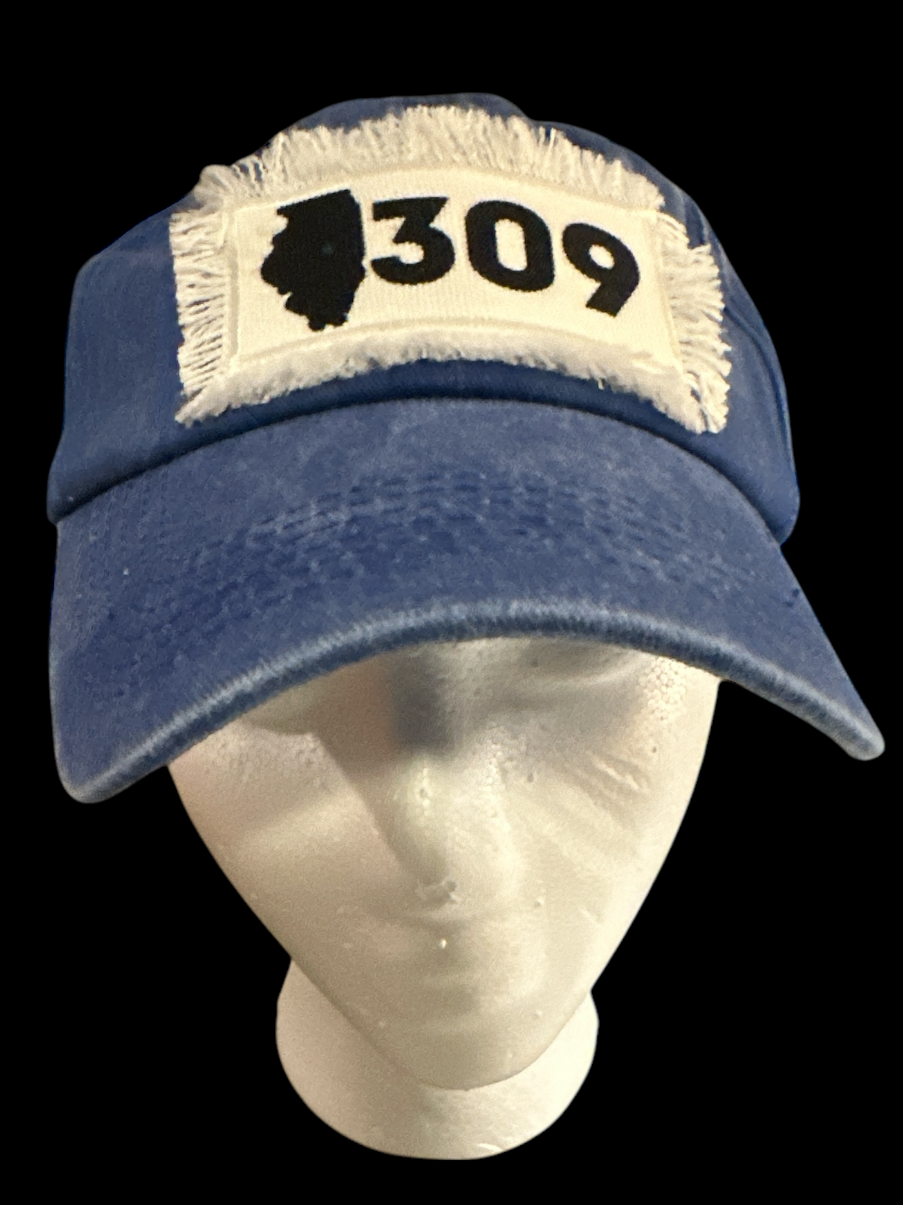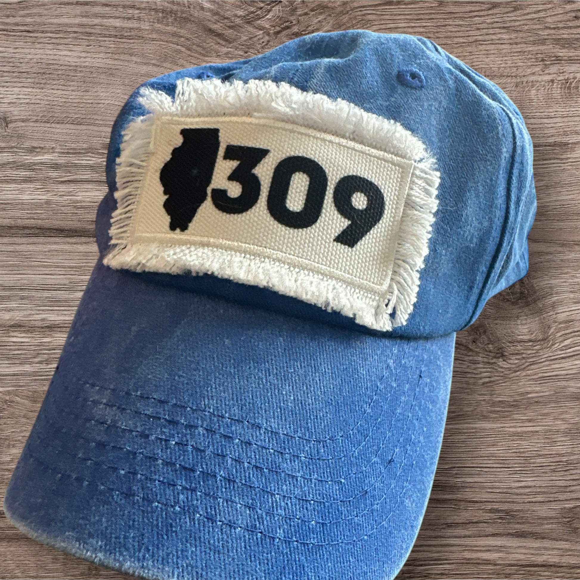 Vintage Blue 309 Ball Cap – Represent your Illinois pride in style! This distressed blue cap features a frayed patch with the state of Illinois and the iconic 309 area code, making it the perfect accessory for locals, alumni, and anyone who loves the heart of the Midwest.